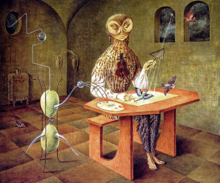 Carrington and Varo enjoying concocting magic potions from the herbs they’d gather at the Mexican markets and cooking surrealist meals. They turned their daily life into a magical act, which also permeated their work, as seen in paintings such as ‘Friday’ or ‘Night of the Eight’(Carrington), and Varo’s ‘The Creation of the Birds.’