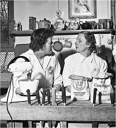 Julia Child met Simone Beck, nicknamed Simca, in 1951 at a party in Paris, They immediately connected, discussing "food, food preparation, food people, wine, and restaurants."